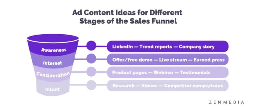 - Tout comme vous le faites avec le contenu, vous devez créer des publicités pour différentes étapes de l'entonnoir de vente/du parcours d'achat du client.