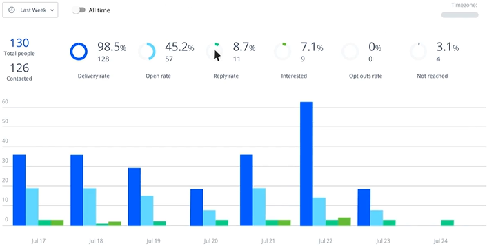 L'outil permet d'engager des prospects, d'envoyer des e-mails froids et de gérer les e-mails dans un seul format. Il comprend des tests fractionnés, un capteur de prospects, un numéroteur téléphonique et une sensibilisation sociale.