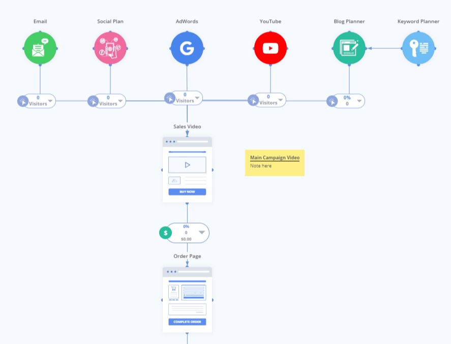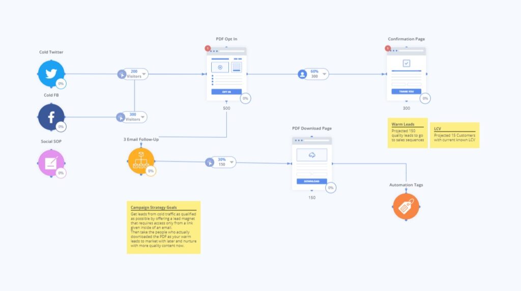C'est un modèle qui contient tout sur votre processus marketing, depuis vos sources de trafic, les étapes de vos entonnoirs, les points d'interaction client, les pages de destination et même les méthodes de remarketing.
