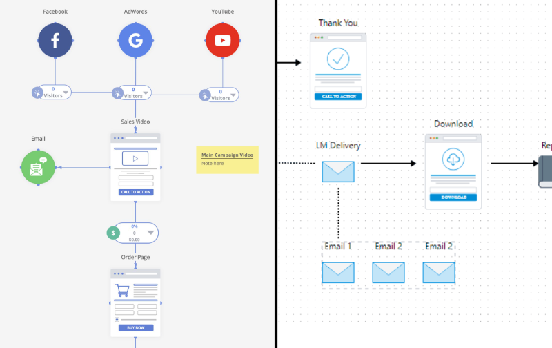 - Cartographie des entonnoirs et de la stratégie marketing : MarketPlan et Funneltyics ont tous deux un très bon canevas qui vous permet de cartographier vos entonnoirs de marketing et de vente. Il existe de nombreuses sources de trafic et types de pages parmi lesquels choisir dans les deux outils.