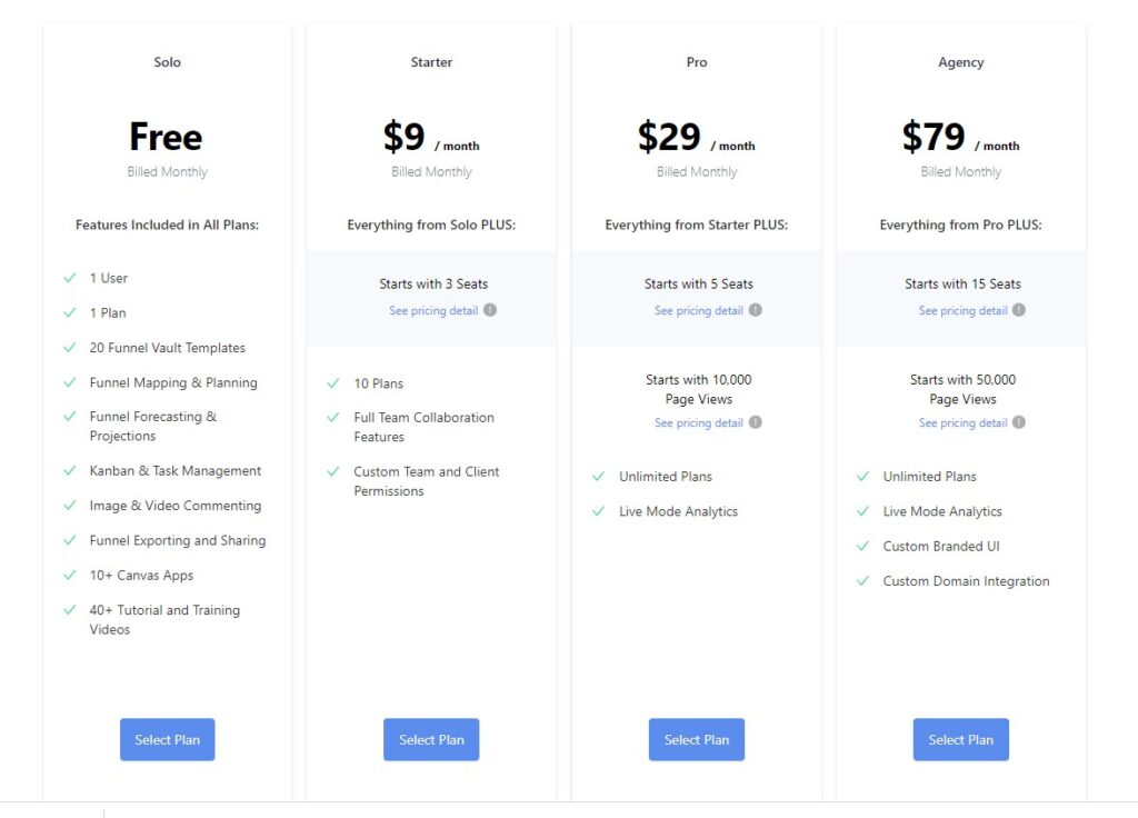 Les plans pour la cartographie de l'entonnoir et les projections commencent à 9 $ par mois dans Marketplan, alors qu'il en coûte 49 $ par mois dans Funnelytics.