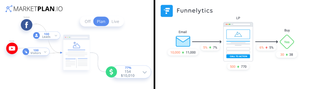 Deux des meilleurs choix pour une telle plate-forme sont MarketPlan (photo de gauche) et Funnelytics (à droite), mais la question demeure : laquelle est la bonne pour vous ?