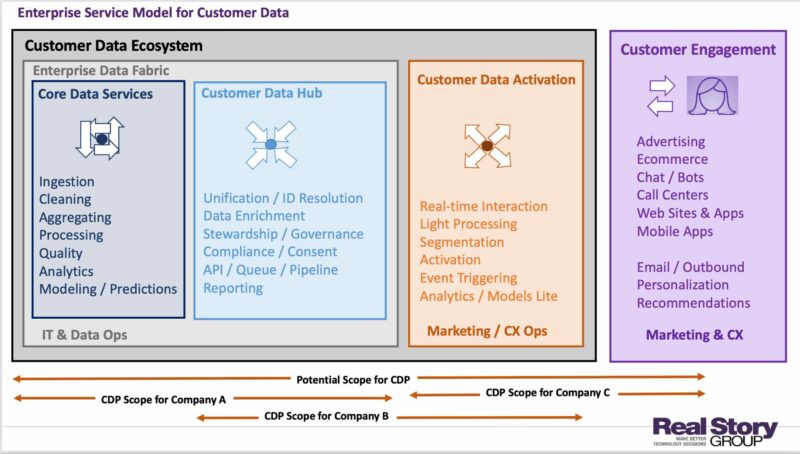 Dans une organisation plus grande, ces deux phases initiales se déroulent généralement au sein d'une partie d'un « tissu » ou d'un « maillage » de données d'entreprise plus large. L'entreprise typique possède déjà des outils de gestion des données pour gérer ces services - comme les lacs de données, les entrepôts, les outils ETL, la qualité et la gouvernance, etc. - et les applique aux données des clients. Cependant, comme nous le verrons ci-dessous, de nombreux outils CDP packagés fournissent également certains de ces services. Dans tous les cas, les équipes IT et Data des entreprises deviennent des acteurs importants de ces deux premières étapes.