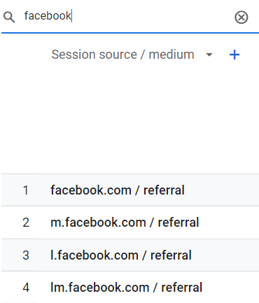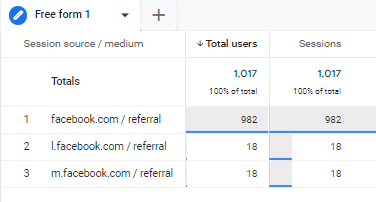 Di Google Analytics 4, Anda dapat menggunakan Laporan Eksplorasi untuk mengelompokkan saluran sesuai dengan kondisi Anda dan melihat statistik. Misalnya, Anda dapat mengelompokkan sumber Facebook: