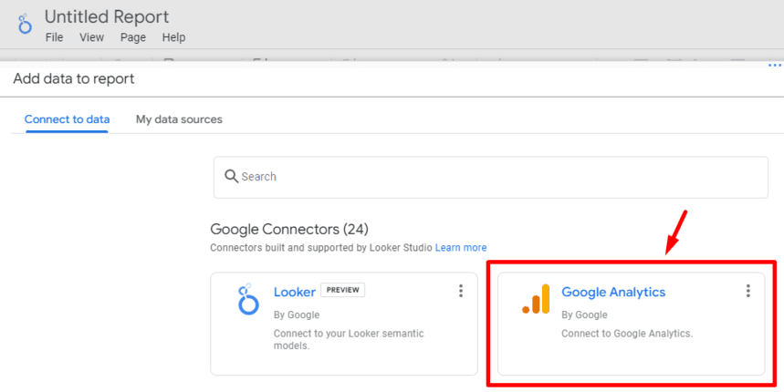 Di jendela yang terbuka, pilih sumber data. Dalam kasus kami, ini adalah Google Analytics :