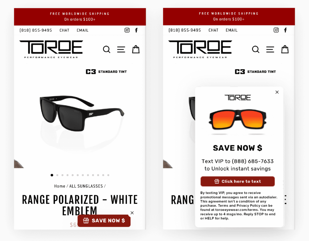 Menggunakan Widget Pendaftaran Seluler kami, merek sunglass menawarkan diskon 10% kepada pengunjung situs web jika mereka mengirim teks dengan kata kunci “HELLO.” (Kata kunci SMS adalah kata atau frasa yang dikirim pelanggan ke nomor Anda untuk menerima pesan teks di masa mendatang.)