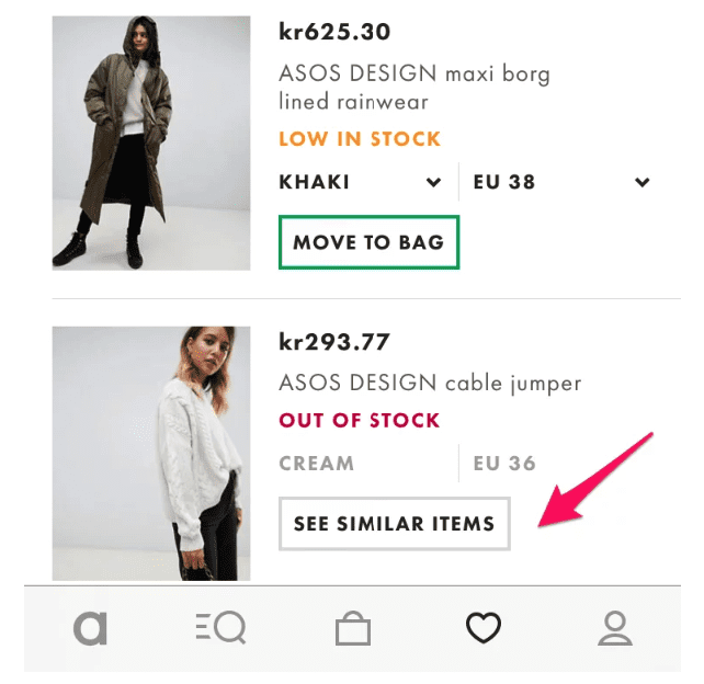Berikut contoh lain dari aplikasi ASOS, yang memberi Anda opsi untuk melihat item serupa.