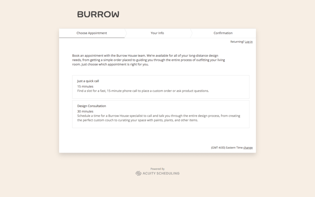 Berikut adalah contoh pengalaman percakapan salah satu merek DTC: “Burrow House from home.” Merek furnitur DTC memungkinkan Anda memesan janji temu 15 atau 30 menit dengan salah satu ahli desain penuh waktu yang terlatih dari perusahaan.