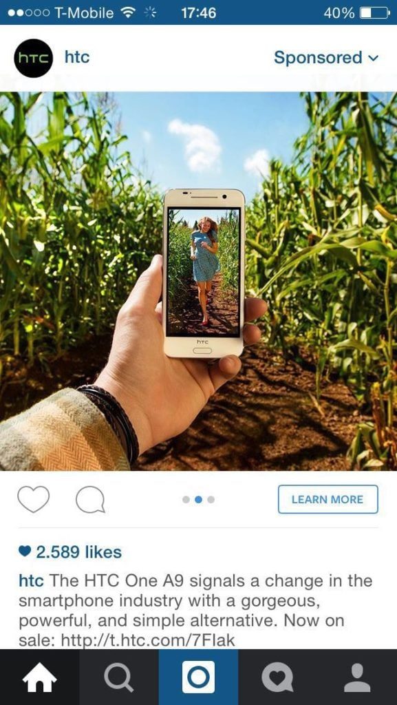 Anda juga dapat menyorot USP (Unique Selling Proposition) Anda melalui iklan Anda. HTC mempromosikan smartphone mereka dalam contoh ini.