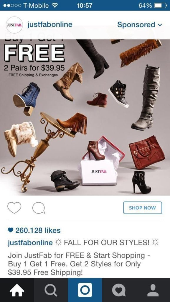 Dalam contoh di atas, audiens yang ditargetkan mungkin sudah mengikuti JustFab di Instagram atau mengetahui penawaran mereka. Diskon memberikan dorongan yang sangat dibutuhkan kelompok sasaran ini untuk membeli produk mereka.