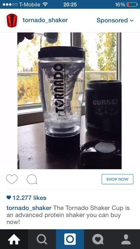 Ada beberapa cara untuk membangun brand melalui iklan Instagram. Salah satu cara untuk melakukannya adalah dengan menampilkan aset merek Anda secara langsung melalui iklan. Dalam contoh di bawah ini, penjual shaker cup menunjukkan kegunaan produk dan branding mereka dalam satu pesan.