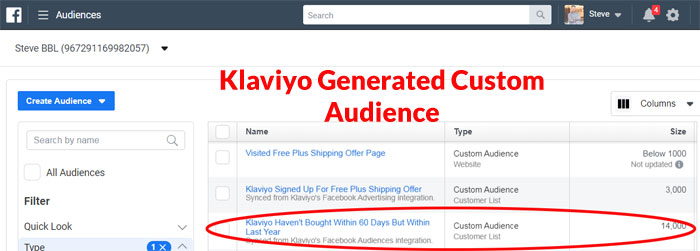 Dengan menekan satu tombol, saya bisa langsung membuat custom audience di Facebook yang diperbarui secara dinamis oleh Klaviyo.