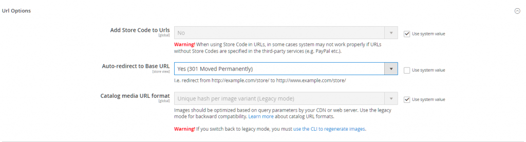 - Pilih dropdown Url Options , ubah Auto-redirect ke Base URL menjadi Yes (301 Moved Permanently)