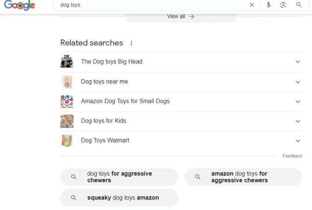 Misalnya, Seorang pengguna yang mencari makanan anjing secara online dapat mencari dengan bantuan kata kunci atau frasa berikut.