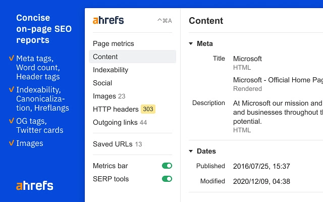 Ekstensi dapat membantu dalam menganalisis format konten dan kinerjanya secara keseluruhan. Selain itu, pengguna mendapatkan jumlah backlink untuk halaman yang mereka lihat dan dengan mudah mengekstrak halaman kanonik.