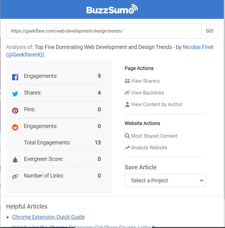 Sebagai Alat SEO, BuzzSumo telah mencapai tingkat popularitas baru, tetapi tidak bertambah tinggi sebagai ekstensi Google. Ekstensi BuzzSumo menawarkan wawasan mendalam tentang artikel dan data keterlibatan sosial. Ini membantu dalam melihat detail media sosial, seperti siapa yang membagikannya di platform sosial apa pun.
