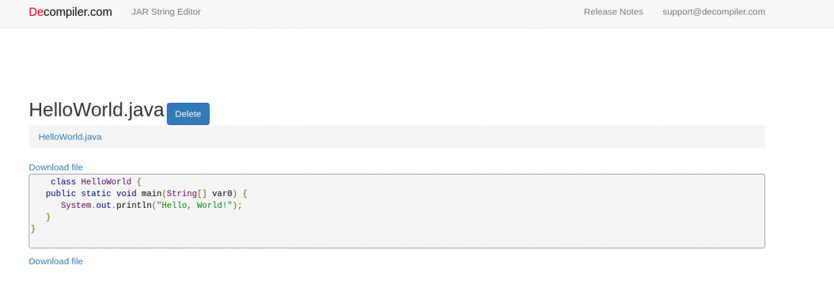 Sekarang saya memiliki file HelloWorld.class di direktori saya saat ini. Saya akan memasukkannya ke Decompiler dan melihat apa yang saya dapatkan.