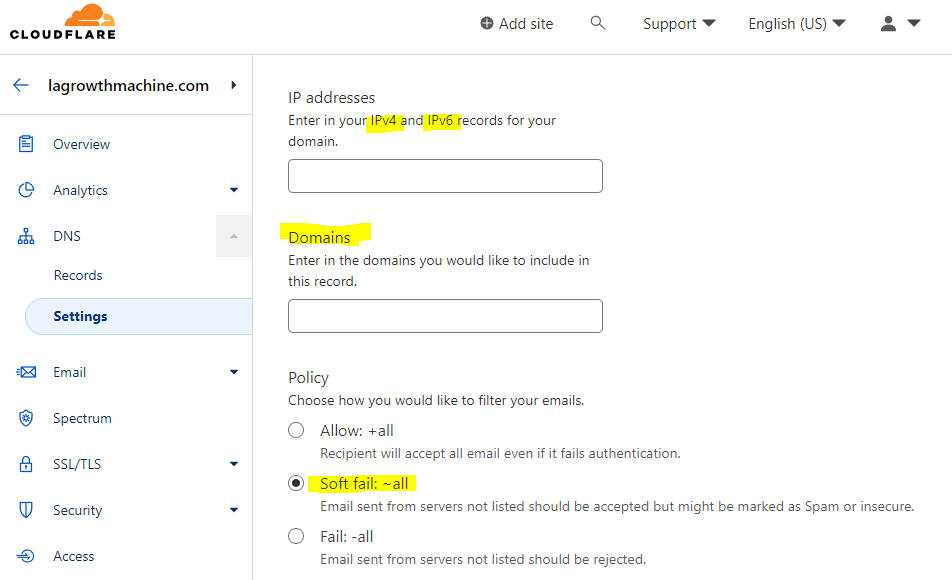 Kebijakan email SPF khusus ini disiapkan sehingga email hanya boleh berasal dari 12.34.56, 78/28, dan lagrowthmachine.com.