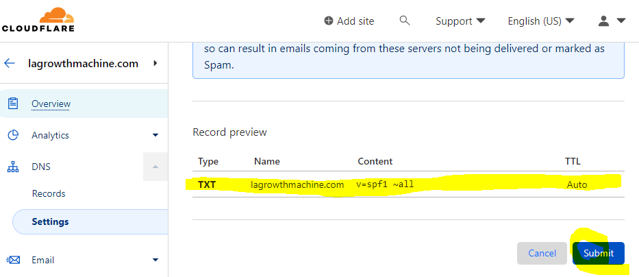 Setelah membuat entri TXT baru , Anda hanya perlu mengirimkan kode di konsol DNS (dalam contoh ini, v=spf1 a ip4:12.34.56.78/28 include:lagrowthmachine.com ~all).