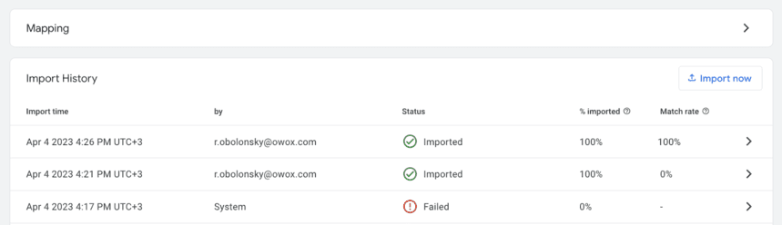 Jika kita melihat kolom Tingkat kecocokan, kita akan melihat angka nol di sana. Artinya GA4 tidak bisa mencocokkan data yang diunggah dengan informasi yang sudah ada di sistem karena tidak ada kunci (utm_id) untuk memadukan data.