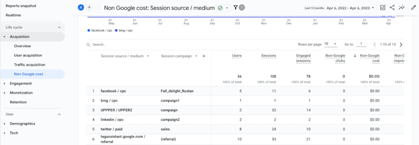 Untuk mengisi kolom klik, tayangan, dan pengeluaran dengan nilai, bukan nol, Anda perlu mengunggah file CSV dengan data biaya ke Google Analytics 4.