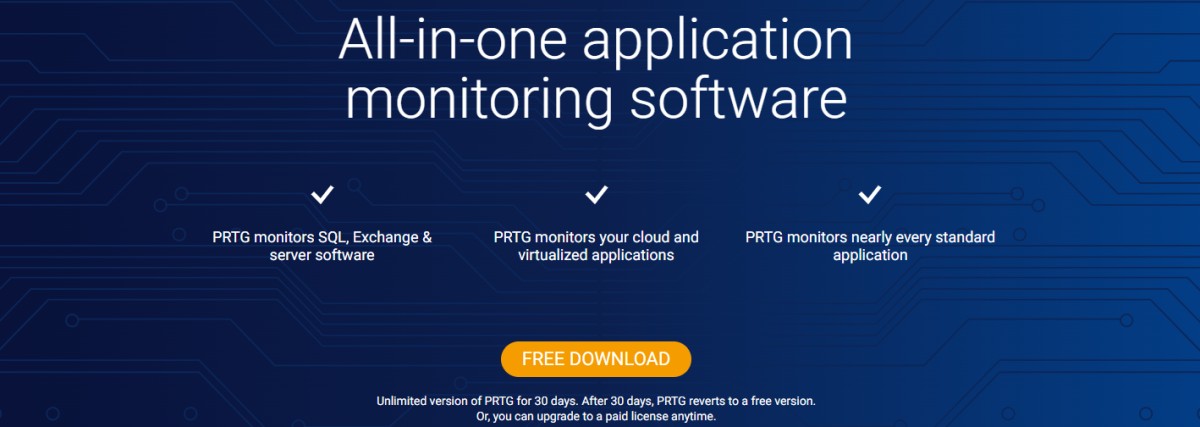 Dapatkan perangkat lunak pemantauan lengkap untuk aplikasi web Anda dengan alat Monitor Jaringan PRTG. Ini memonitor aplikasi virtual dan cloud Anda, Exchange, Server, perangkat lunak SQL, dan aplikasi standar lainnya. Alat ini memastikan bahwa semua aplikasi Anda berjalan dengan lancar dan bekerja seperti yang diharapkan.