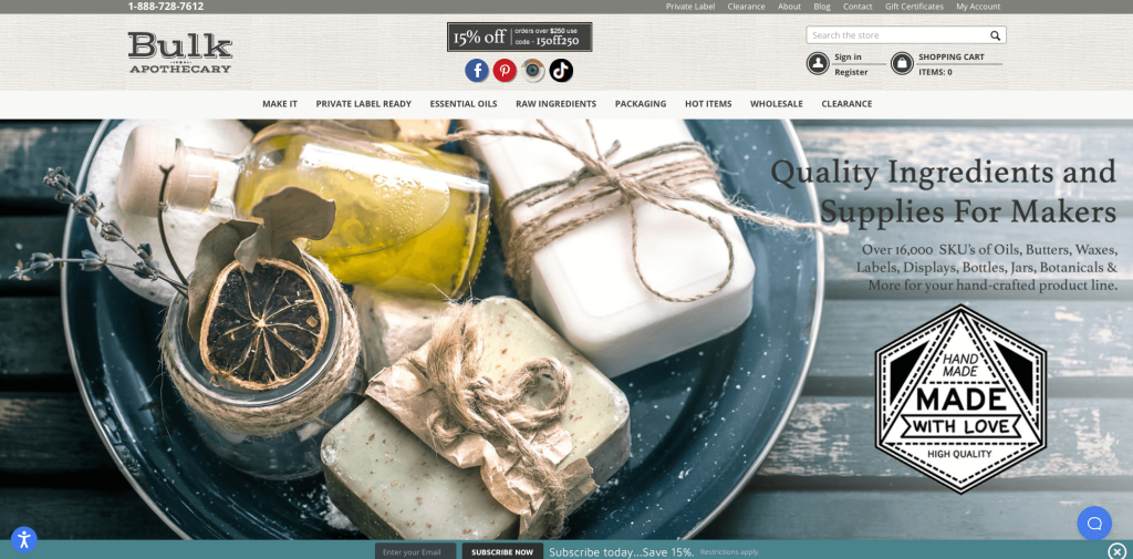 Il sito Web di Bulk Apothecary è uno dei siti BigCommerce più belli in circolazione. Il sito utilizza una combinazione di colori nero, bianco e verde, che gli conferisce un aspetto moderno e pulito. Il layout è facile da navigare e i prodotti vengono visualizzati. Un'altra cosa grandiosa di questo sito sono i suoi numerosi sconti e promozioni. Bulk Apothecary è stata fondata nel 2010 per fornire rimedi naturali per disturbi comuni a un prezzo accessibile. Credono che tutti dovrebbero avere accesso a un'assistenza sanitaria di qualità, indipendentemente dal budget o dalla posizione geografica. Nel complesso, pensiamo che amerai il fascino estetico e l'utile servizio clienti di Bulk Apothecary!
