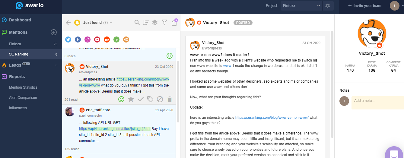 Awario ti consente di monitorare le menzioni sui social media in tempo reale e di rispondere ad esse dalla dashboard. Lo strumento include una gamma di funzionalità, tra cui analisi approfondite, prospezione di vendita, ricerca booleana, ecc.