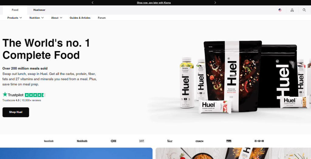 Huel vende prodotti nutrienti. Il suo sito web alimentare ha anche suggerimenti per aiutare gli utenti a mantenere uno stile di vita sano. Il layout semplice e ben progettato consente ai clienti di concentrarsi sulla gamma di prodotti principale di Huel.