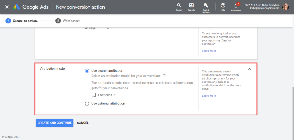 9. Infine, dovrai impostare il tuo modello di attribuzione. In parole povere, un modello di attribuzione è una regola o un insieme di regole che determina il modo in cui Google Ads applica il credito per le conversioni e le vendite. Google Ads fornisce i seguenti modelli di attribuzione: basato sui dati, ultimo clic, primo clic, lineare, decadimento temporale e basato sulla posizione. Puoi importare la tua attribuzione esterna. Puoi saperne di più qui.