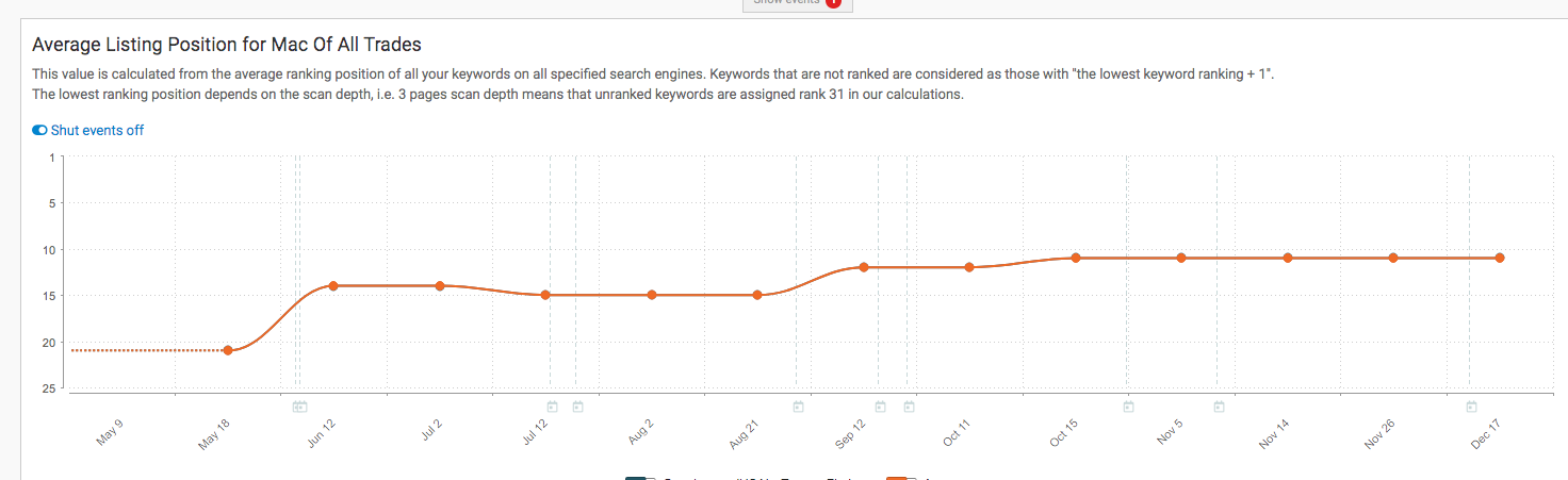 Abbiamo anche visto aumentare complessivamente la visibilità media del sito. La classifica media di Mac of All Trades era il 21° posto all'inizio della campagna. Ora, dopo 7 mesi, la parola chiave Mac di All Trades media si trova all'undicesima posizione. Il loro punteggio di traffico e la posizione media in classifica ora superano anche concorrenti di grandi nomi nello spazio come MacWorld e New Egg.