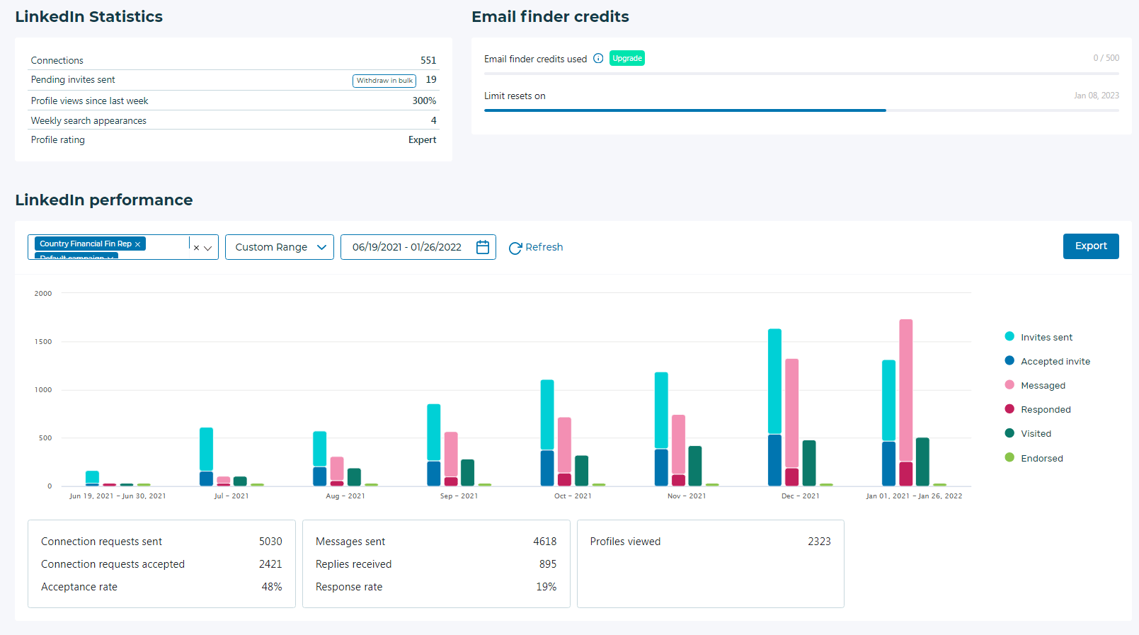 Utilizza la dashboard interattiva di Octopus CRM per monitorare i tuoi sforzi di reclutamento. La piattaforma ti consente di visualizzare le statistiche relative al tuo profilo LinkedIn, incluso il numero di visualizzazioni del profilo e il tasso di presenza.