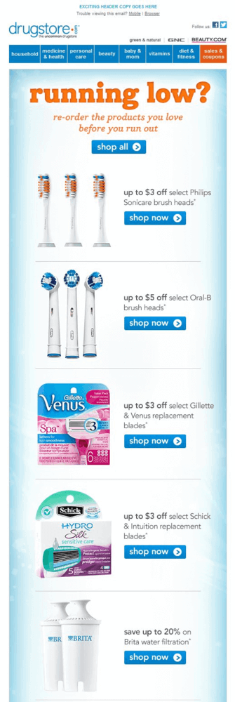 In ciascuno di questi casi, il tuo obiettivo è inviare queste e-mail subito prima che i tuoi clienti tendano a farlo di propria volontà. Ad esempio, se un cliente tende ad acquistare nuove testine di spazzolino una volta ogni due mesi, dovresti inviare un promemoria di rifornimento intorno alla 6-7 settimana. Aspetta ancora e potrebbero finire per rifornire la loro scorta altrove; ricordaglielo prima e non sentiranno il bisogno di impegnarsi con la tua offerta in questo momento.