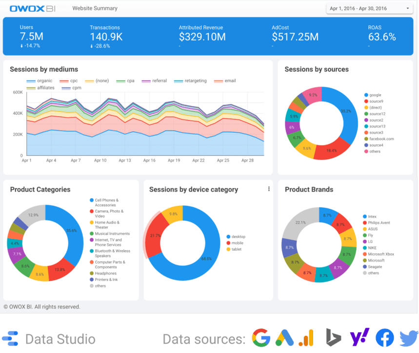 中小企業の場合、Google Analytics、Google Data Studio、OWOX BI Smart Data の機能で十分です。 より高度なダッシュボードについては、Google BigQuery + OWOX BI + Google Data Studio、Tableau、または Power BI などのより多くの機能を備えたシステムを検討してください。