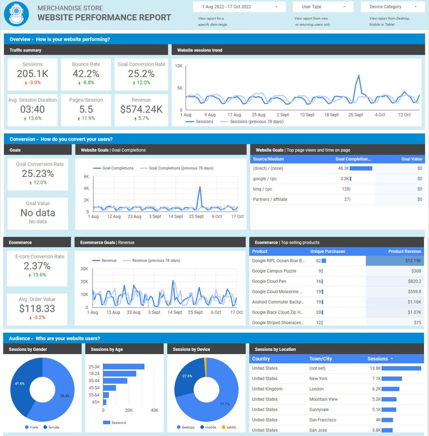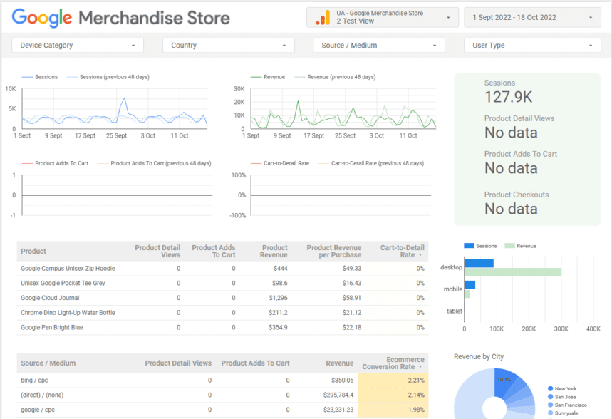 このダッシュボードは、追加の詳細がない単純なレポートの優れた例です。 これを使用して、収益、セッション、カートから詳細までの率、カートに追加された製品などの重要なディメンションと指標を使用して全体的なパフォーマンスを推定できます。フィルターを使用して、デバイス、国、ソース/メディア、ユーザーごとに情報を表示できます。タイプ、または他のカテゴリ。