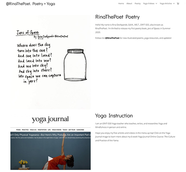 リナ・デシュパンデは詩人、作家、教育者です。 リナの興味は、ヨガから詩、イラストレーション、学校教育まで多岐にわたります。 これは、彼女の多様な興味のすべてを取り、それらすべてを1つのまとまりのあるウェブサイトにまとめるという素晴らしい仕事をしている彼女の著者のウェブサイトで非常に明白です。 リナはまた、自分のWebサイトを使用して、ソーシャルメディアプラットフォームや、作品が公開されている主流のメディアプラットフォームなど、他のチャネルにリンクしています。 そうすることで、リナは自分のウェブサイトを効果的なマーケティングツールに変えることができます。