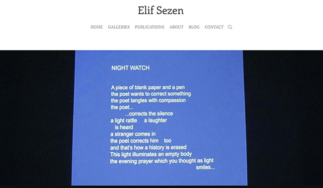 Elif Sezenは、トルコとオーストラリアの学際的な芸術家、バイリンガルの作家、詩人、研究者、翻訳者です。 彼女の芸術作品は、執筆を含む多くの異なるジャンル、分野、媒体にまたがっています。 記憶とさまざまな形の記憶の探求は彼女の作品に顕著に現れており、彼女は自分のウェブサイトのランディングページを通じてこれと同じテーマを呼び起こそうとしています。 彼女のウェブサイトはシンプルですが、そのシンプルさと目的性に影響を与えています。 Elifの作者のウェブサイトは、作家が芸術作品の延長として自分のウェブサイトをどのように使用できるかを示す非常に良い例です。