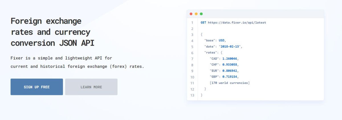 Fixerは、過去および現在の為替レート用の軽量でシンプルなAPIです。 リアルタイムの為替レートの信頼できるデータソースにより、多くのSMB、大企業、および開発者によって毎日使用されています。