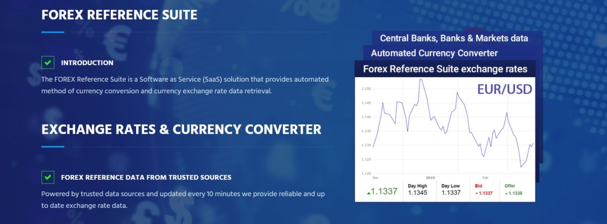 IBANのFOREXリファレンススイートは、自動為替レートデータと通貨換算検索の方法を提供するSaaSソリューションです。 10分ごとにデータを更新し、信頼できるソースからデータを収集するため、常に正確な結果が得られます。