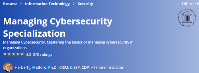 Coursera の Managing Cybersecurity Specialization コースでは、セキュリティ管理、ネットワーク セキュリティ、セキュリティ ガバナンス、リスク管理、サイバー セキュリティ、脆弱性、およびその他の関連トピックについて説明します。