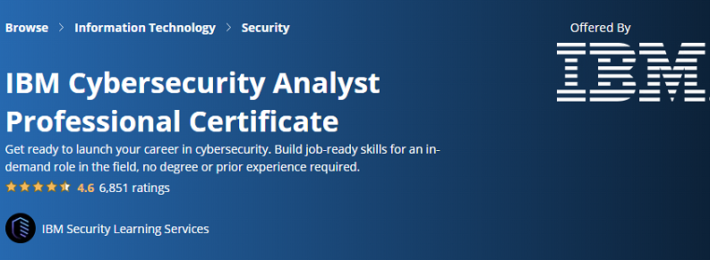 IBM Cybersecurity Analyst Certificate は、Coursera が提供する専門資格であり、技術的習熟度を向上させ、サイバー攻撃やサイバーセキュリティの頂点などに関するコンテンツにアクセスできるようにします。