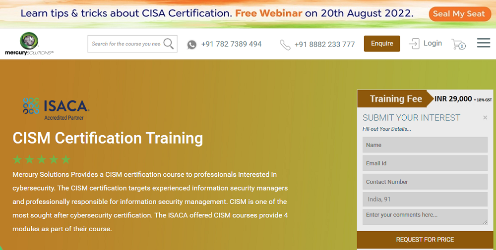 Mercury Solutions は、ISACA (Information System Audit and Control Association) の認定パートナーです。 8 日間続くオンライン CISM トレーニングを提供し、インストラクターによる 32 時間のライブ トレーニングが含まれます。