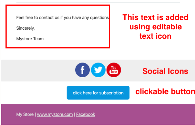 電子メールのフッターセクションには、編集可能なフッターボックス、ソーシャルアイコン、およびクリック可能なボタンが含まれています。 メールのフッターセクションをカスタマイズする方法を教えてください。