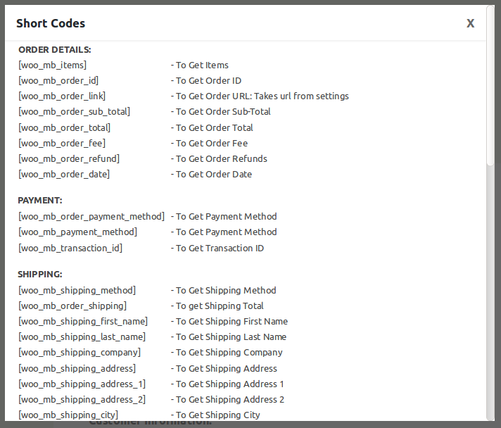 WooCommerceEmailCustomizerのショートコードのリストは上記のとおりです。 特定の要素を編集すると、それぞれのショートコードが含まれます。