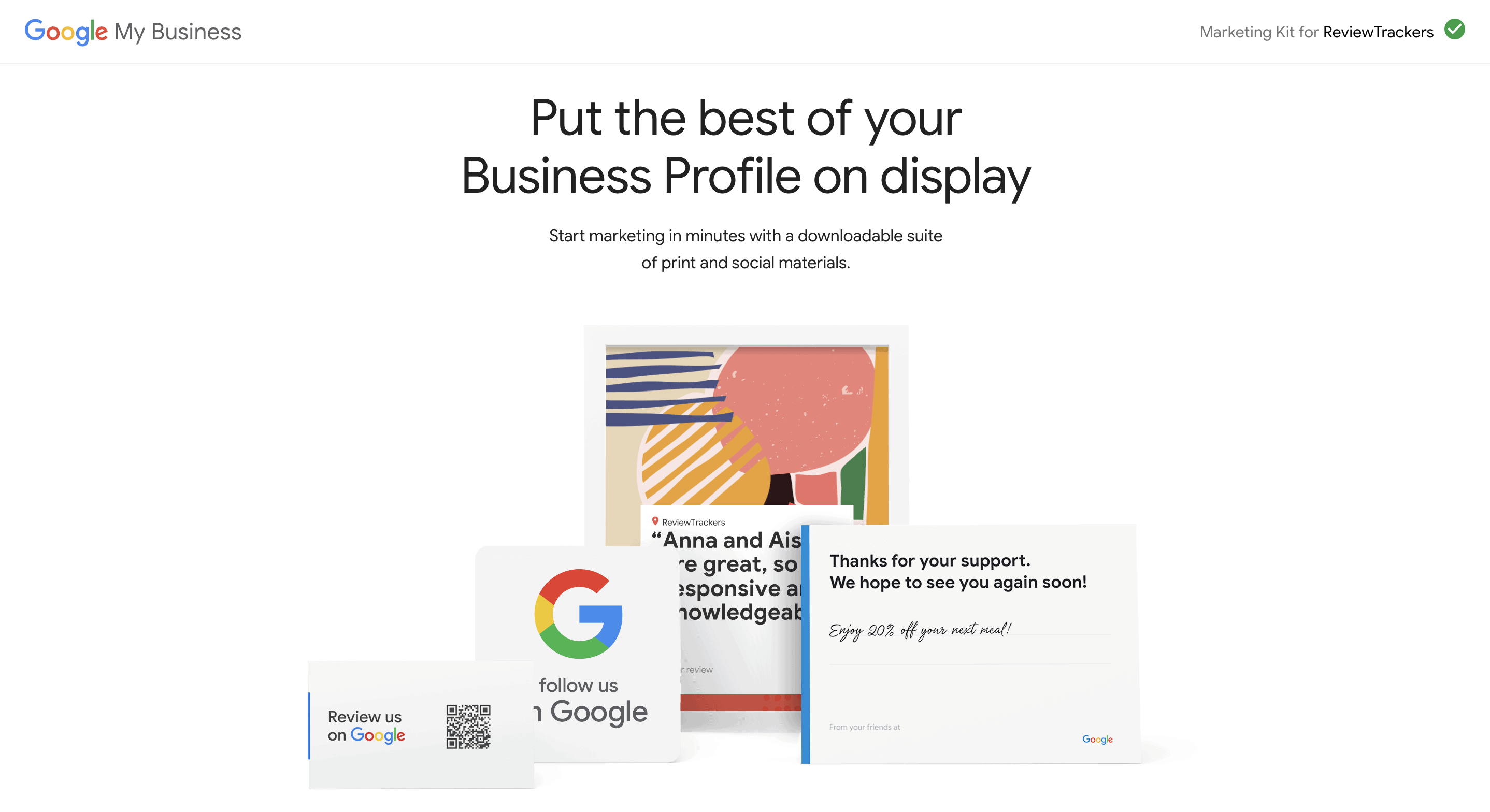 Googleマイビジネスマーケティングキットのウェブサイトでは、購入後にレビューを残すように顧客を説得するのに役立つ、パーソナライズされたマーケティング資料を作成、ダウンロード、および印刷できます。