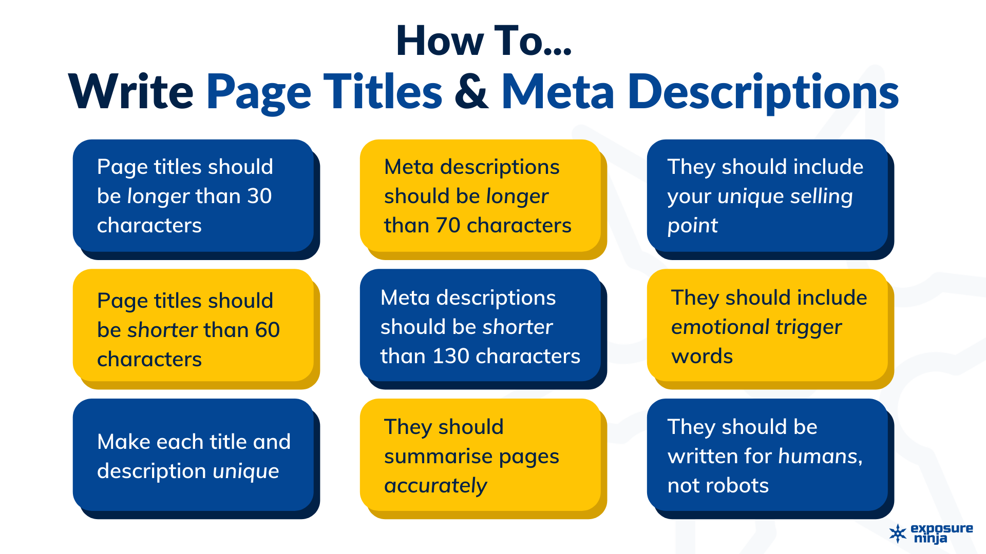 ページのタイトルは、ページの一意の要約である必要があり、欺瞞的ではないことに注意してください。 あなたのページが「エジンバラで最高の会計士」に関するものでなければ、そのタイトルを付けるべきではありません。
