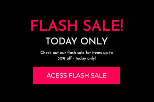 以下は、正しく実行されたFlashSaleポップアップの例です。 ポップアップは、黒、白、ピンクの色の組み合わせを使用して、より目立つようにしています。 ポップアップの内容は可能な限り短くなっています。 一見したところ、お客様はフラッシュセールが行われていることを知ることができ、そのセールの利用可能性は「今日」に制限されています。
