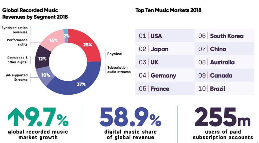 世界の音楽市場は190 億ドル以上の収益を上げており、音楽ストリーミングはその収益のほぼ半分を占めており、世界中で 2 億 5,500 万の有料ユーザーがいます。