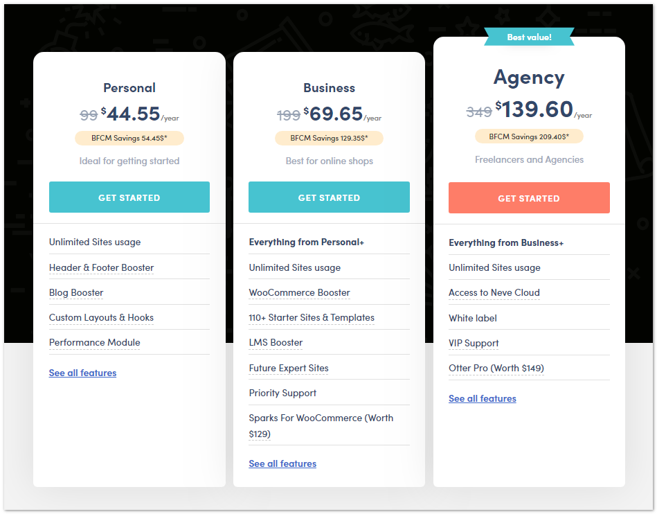 個人のブログを立ち上げる場合でも、中小企業のサイトを立ち上げる場合でも、クライアントの Web サイトを管理する場合でも、Neve はお客様に合わせたプレミアム プランをご用意しています。 無限のクリエイティブな可能性を解き放ち、オンラインでの目標を新たな高みに引き上げましょう! したがって、このブラック フライデーをお見逃しなく、あなたのニーズにぴったりの最高の WordPress テーマを手に入れてください。