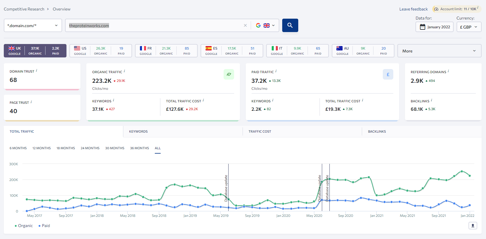 The Protein Worksは、毎月約22万3千人のオーガニックビジターをサイトに呼び込み、3万7千人の有料ビジターをサイトに呼び込んでいることがわかります。